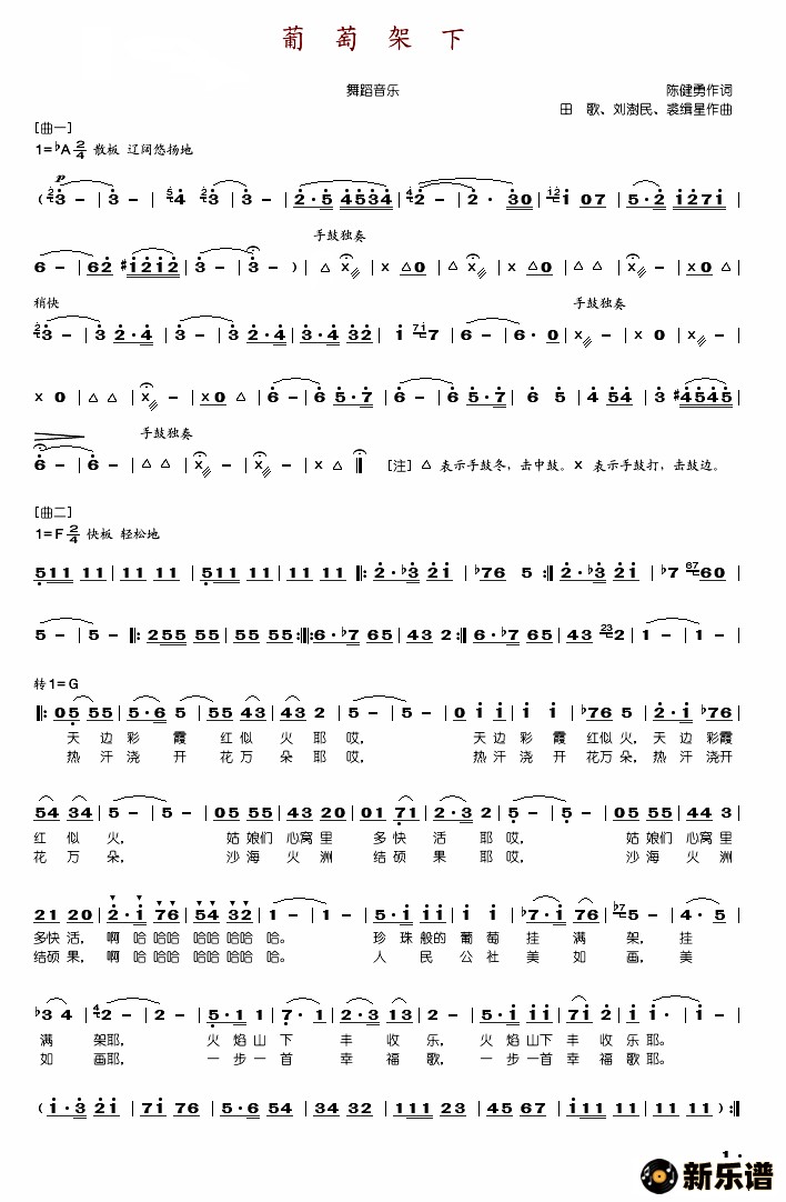 新疆部队政治部文工团演唱的葡萄架下(舞蹈音乐)歌词,葡萄架下(舞蹈音乐)简谱.