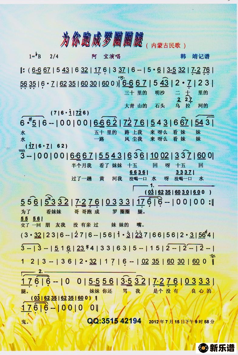 阿宝演唱的为你跑成罗圈圈腿(内蒙古民歌)【彩谱】歌词,为你跑成罗圈圈腿(内蒙古民歌)【彩谱】简谱.