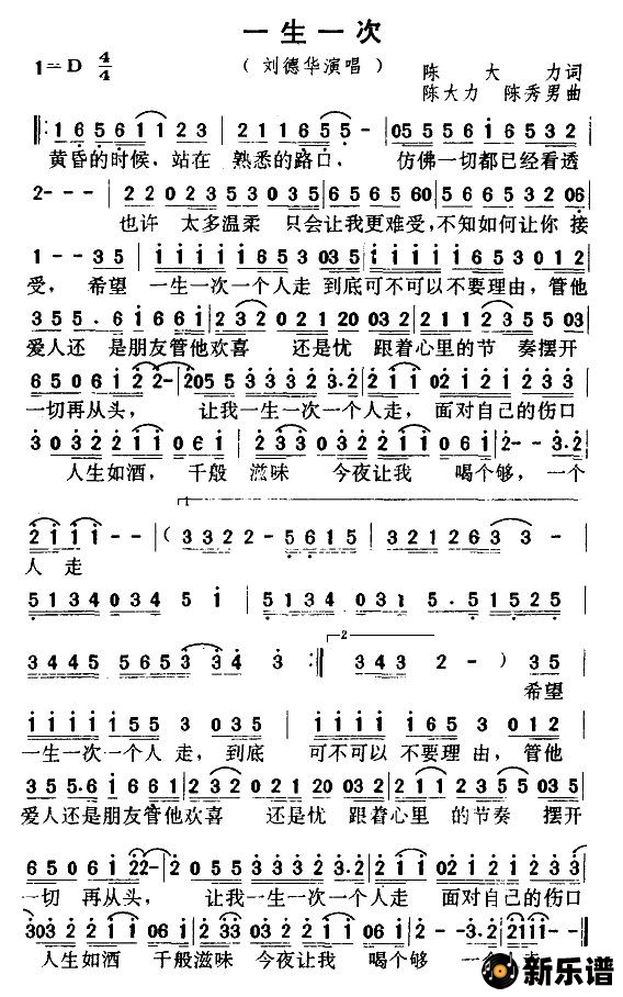 刘德华演唱的一生一次歌词,一生一次简谱.