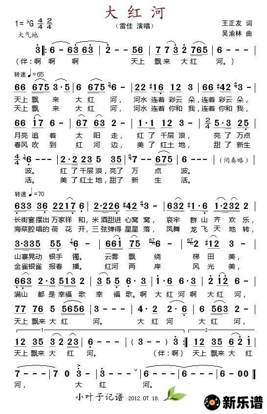 《大红河》简谱 雷佳-小叶子制谱
