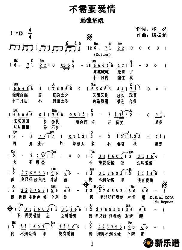 刘德华演唱的不需要爱情歌词,不需要爱情简谱.