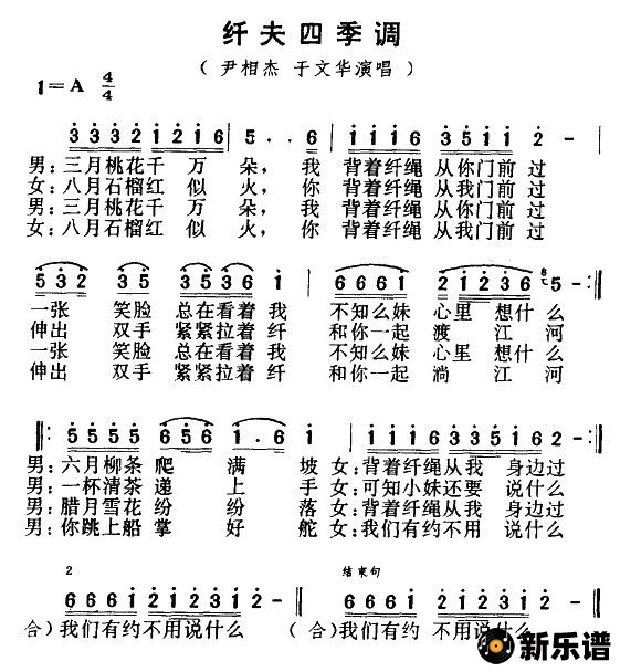 尹相杰/于文华演唱的纤夫四季调-尹相杰 于文华歌词,纤夫四季调-尹相杰 于文华简谱.