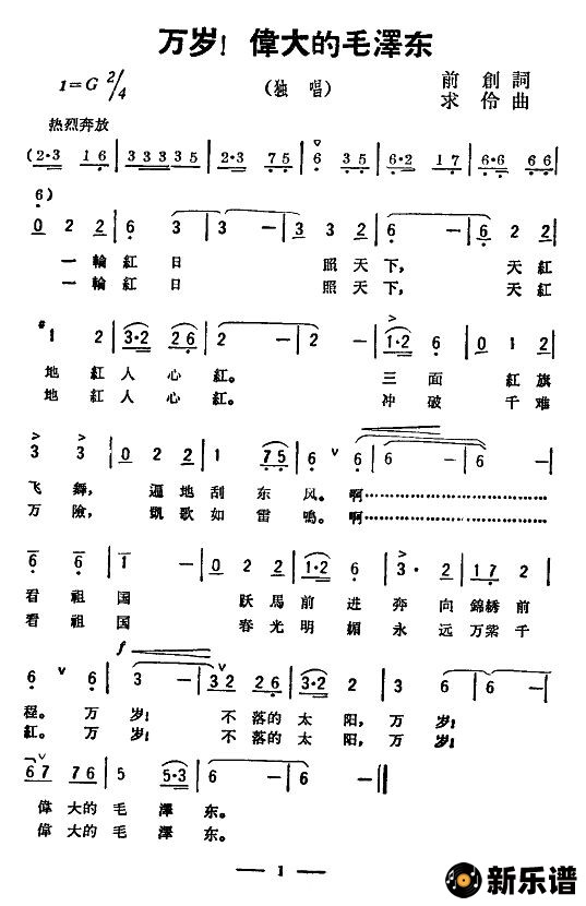 演唱的万岁!伟大的毛泽东歌词,万岁!伟大的毛泽东简谱.