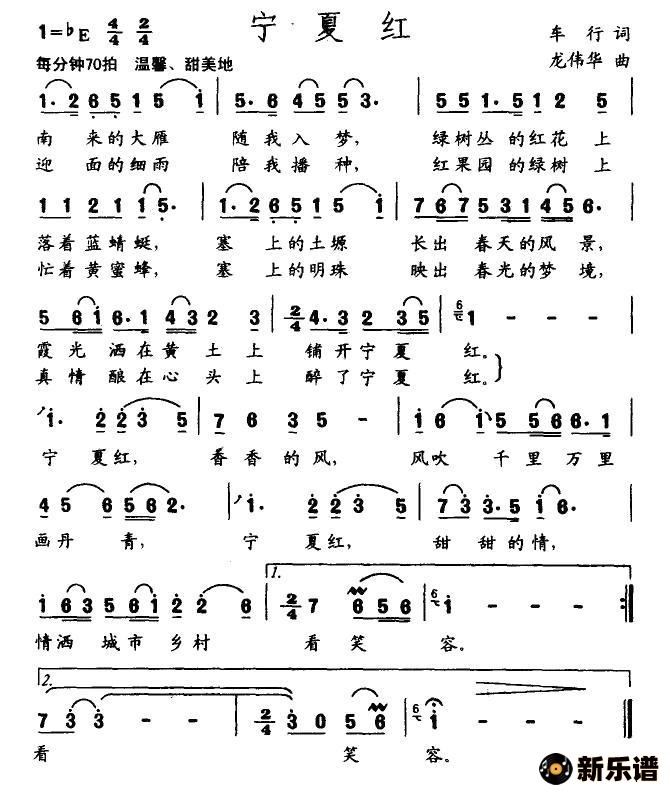 《宁夏红(车行词 龙伟华曲)》简谱
