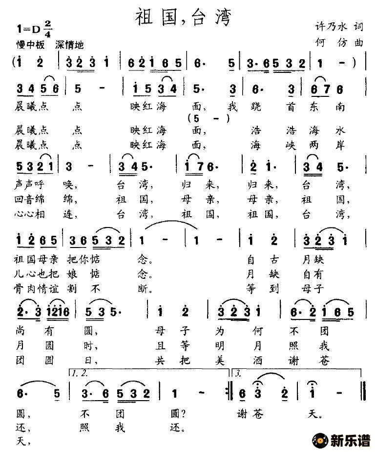 演唱的祖国,台湾(许乃水词 何仿曲)歌词,祖国,台湾(许乃水词 何仿曲)简谱.