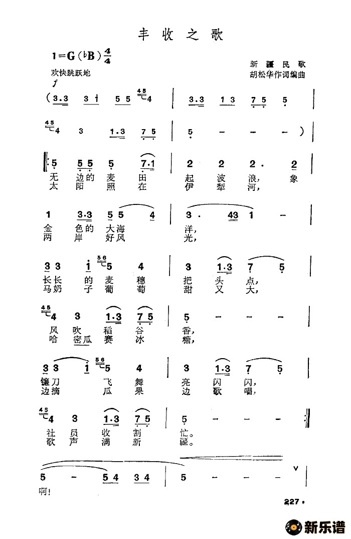 胡松华演唱的丰收之歌(新疆民歌)歌词,丰收之歌(新疆民歌)简谱.