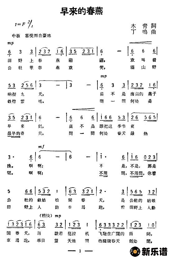 演唱的早来的春燕歌词,早来的春燕简谱.