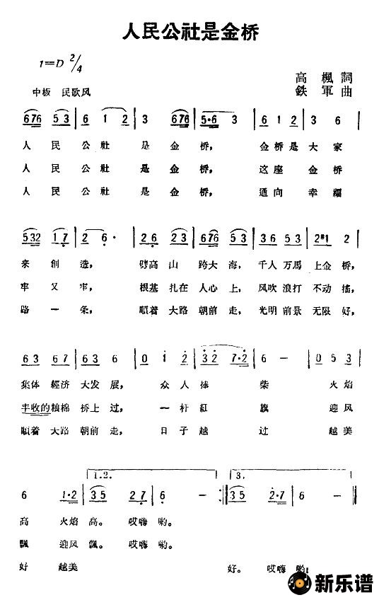 演唱的人民公社是金桥歌词,人民公社是金桥简谱.