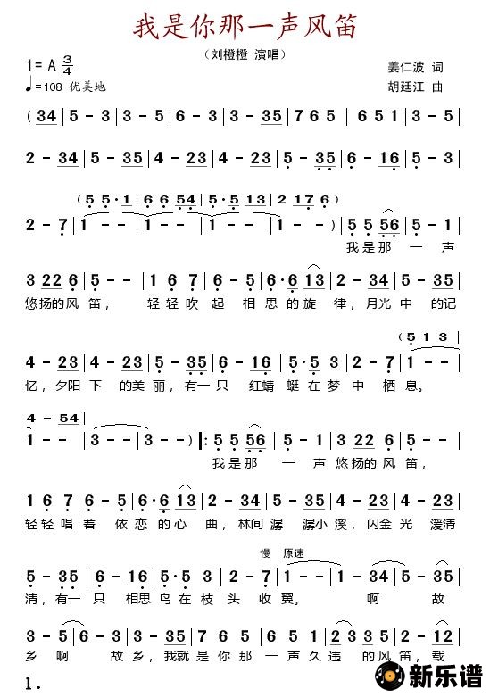 刘橙橙演唱的我是你那一声风笛歌词,我是你那一声风笛简谱.