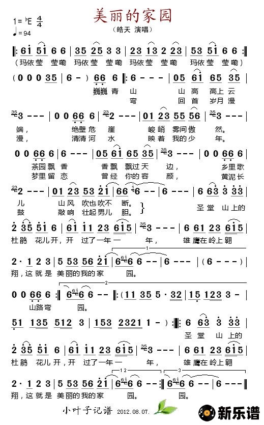 《美丽的家园-皓天》简谱 皓天-小叶子制谱