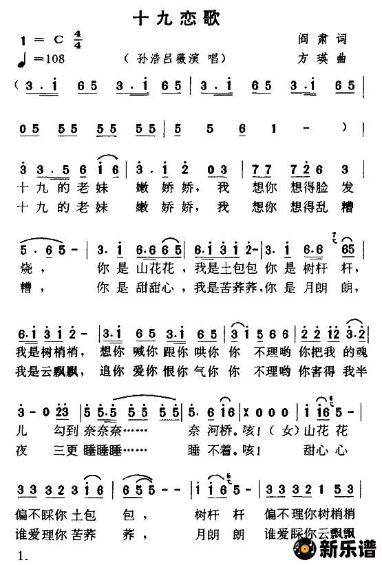孙浩/吕薇演唱的十九恋歌歌词,十九恋歌简谱.