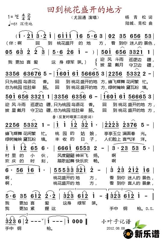 《回到桃花盛开的地方》简谱 尤国通-小叶子制谱
