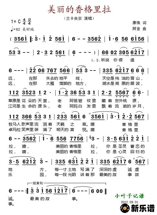 《美丽的香格里拉》简谱 兰卡央宗-小叶子制谱