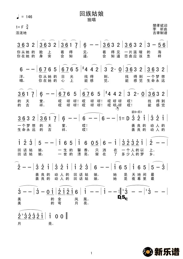 演唱的回族姑娘(独唱)歌词,回族姑娘(独唱)简谱.