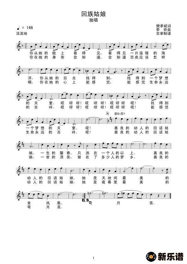 演唱的回族姑娘(线谱)歌词,回族姑娘(线谱)简谱.