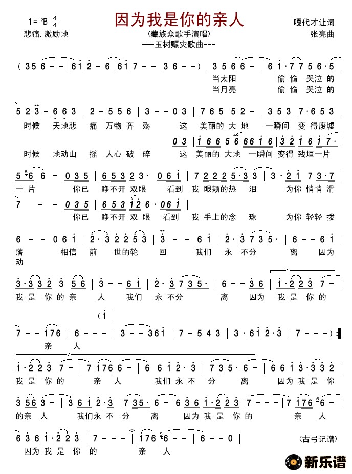 因为我是你的亲人(玉树赈灾歌曲)/藏族众歌手 相关曲谱