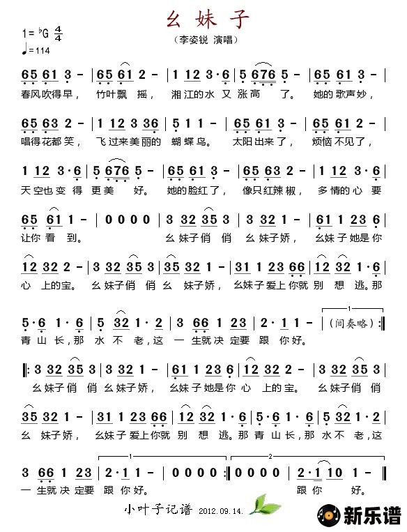《幺妹子》简谱 李姿锐-小叶子制谱