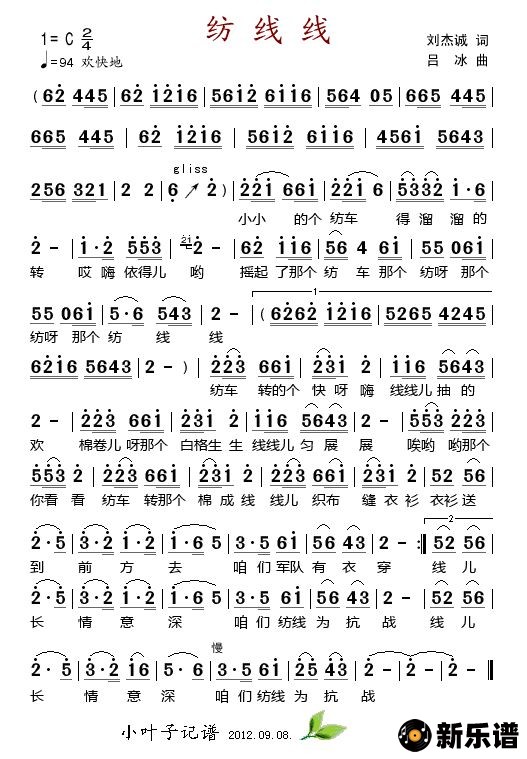 演唱的纺线线(吕冰作曲)歌词,纺线线(吕冰作曲)简谱.