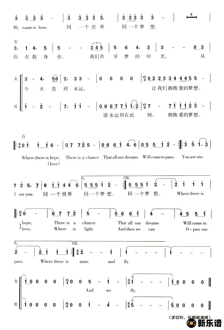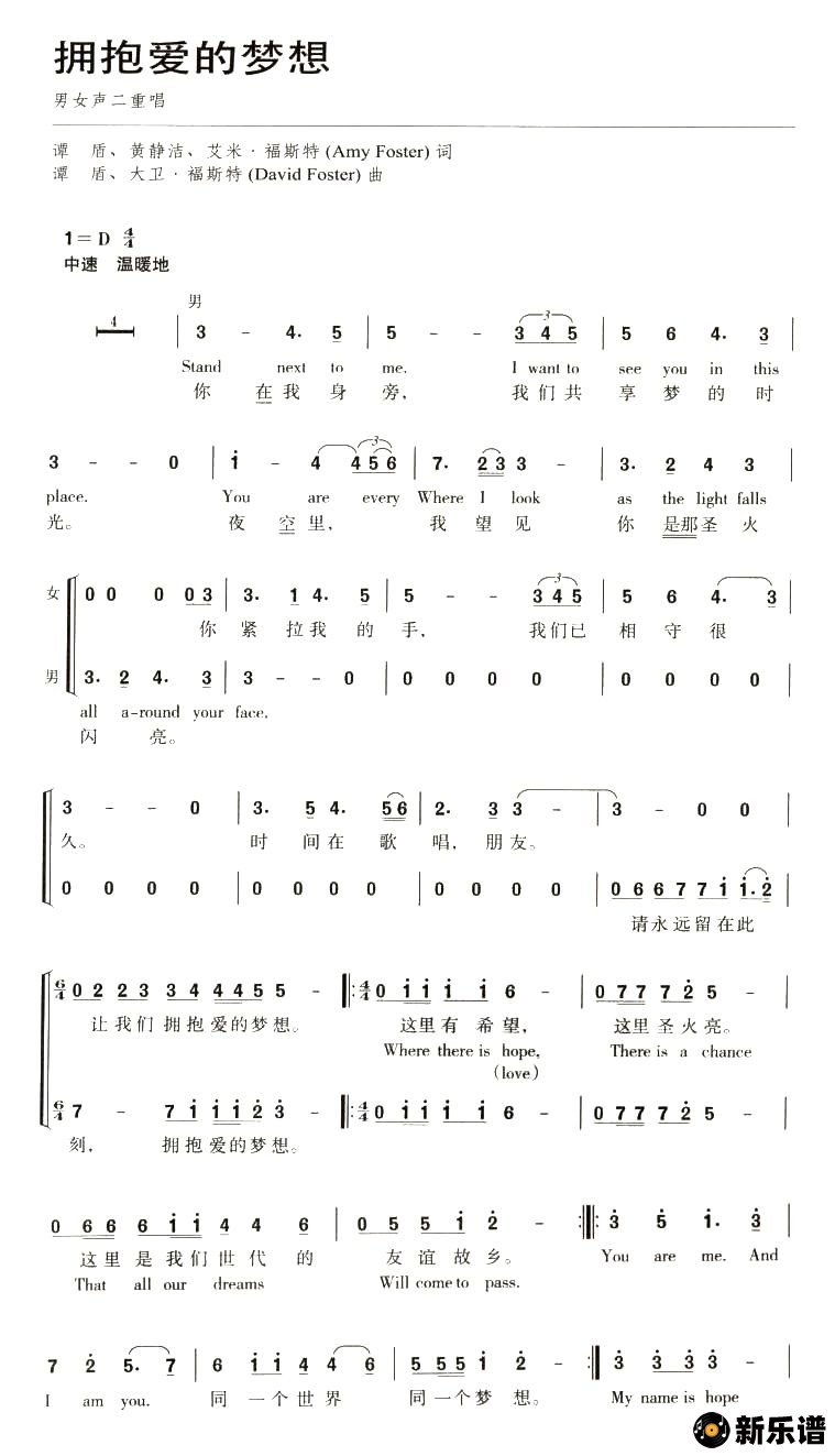 《拥抱爱的梦想》简谱 波切尔/张靓颖-小叶子制谱