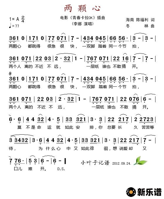 《两颗心(电影《青春卡拉OK》插曲)》简谱 李娜-小叶子制谱