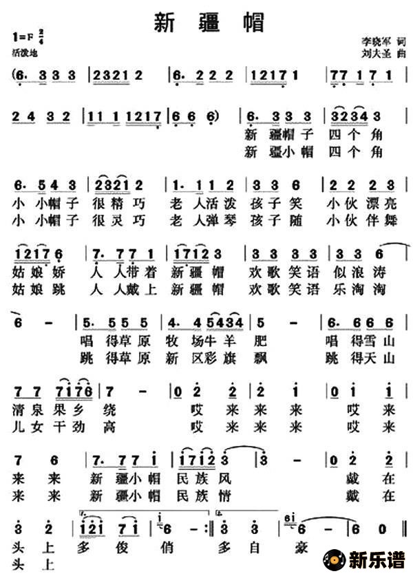 演唱的新疆帽(李晓军词 刘大圣曲)歌词,新疆帽(李晓军词 刘大圣曲)简谱.