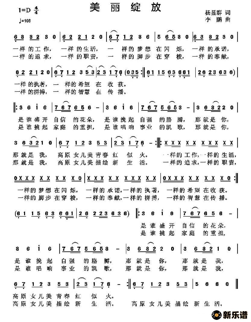 演唱的美丽绽放(云南妇女之歌)歌词,美丽绽放(云南妇女之歌)简谱.