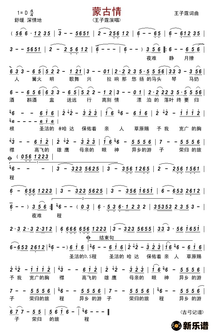 王子霆演唱的蒙古情歌词,蒙古情简谱.