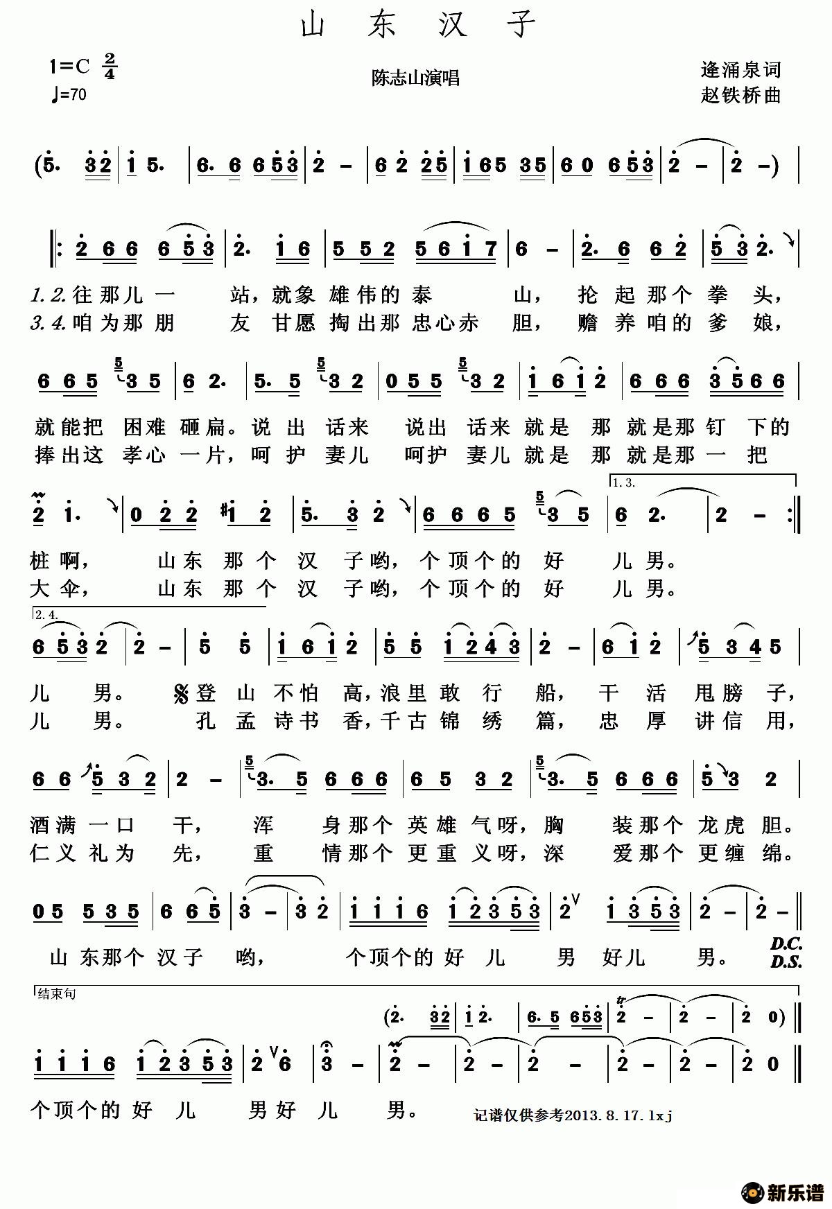 陈志山 演唱的山东汉子(逄涌泉词 赵铁桥曲)歌词,山东汉子(逄涌泉词 赵铁桥曲)简谱.