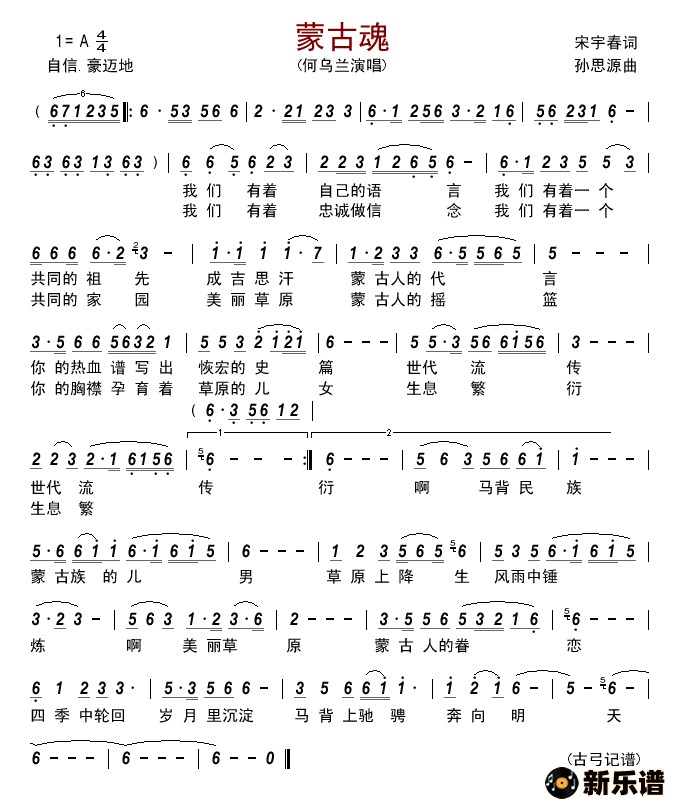 何乌兰演唱的蒙古魂歌词,蒙古魂简谱.