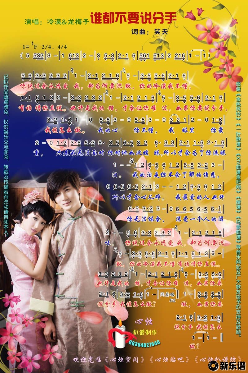 冷漠/龙梅子演唱的谁也不要说分手歌词,谁也不要说分手简谱.