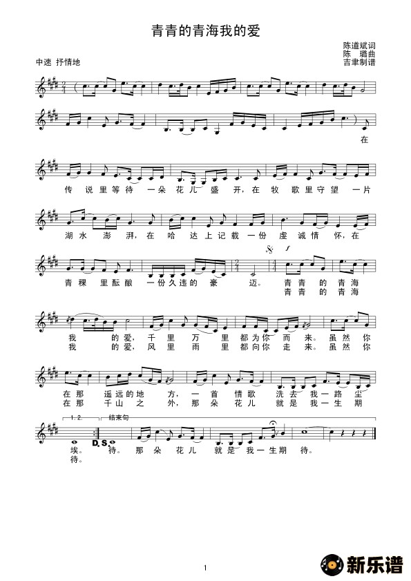 演唱的青青的青海我的爱(线谱)歌词,青青的青海我的爱(线谱)简谱.