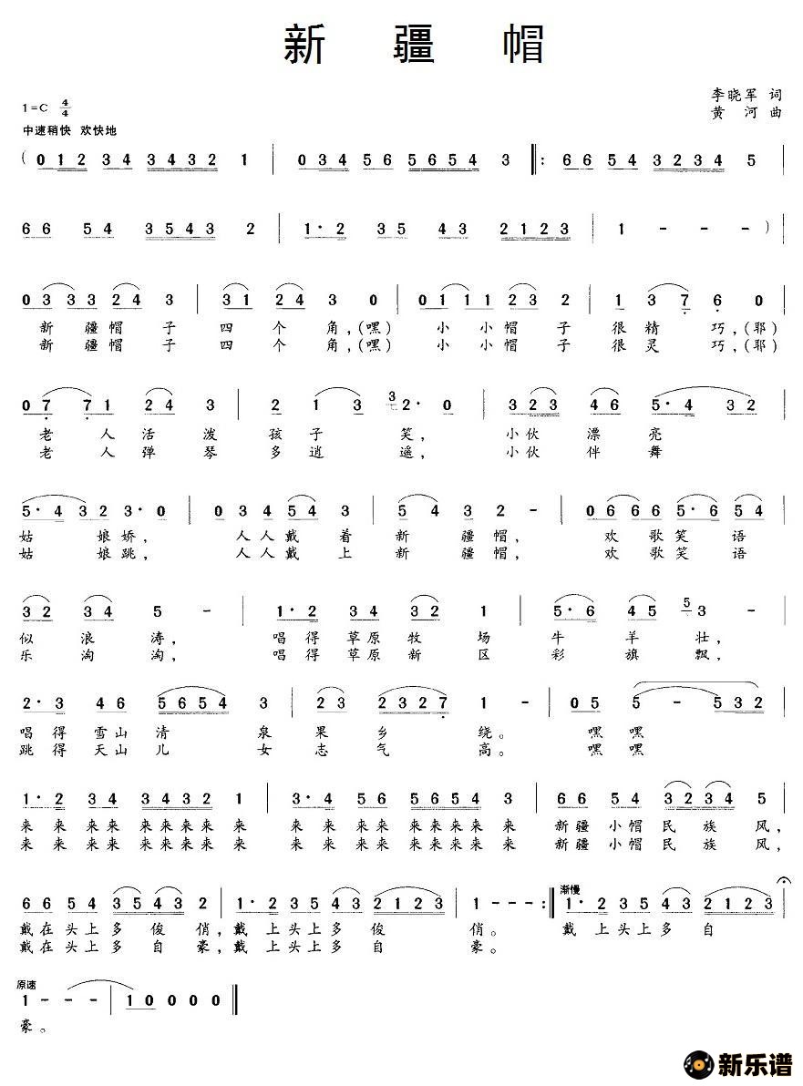 演唱的新疆帽(李晓军词 黄河曲)歌词,新疆帽(李晓军词 黄河曲)简谱.