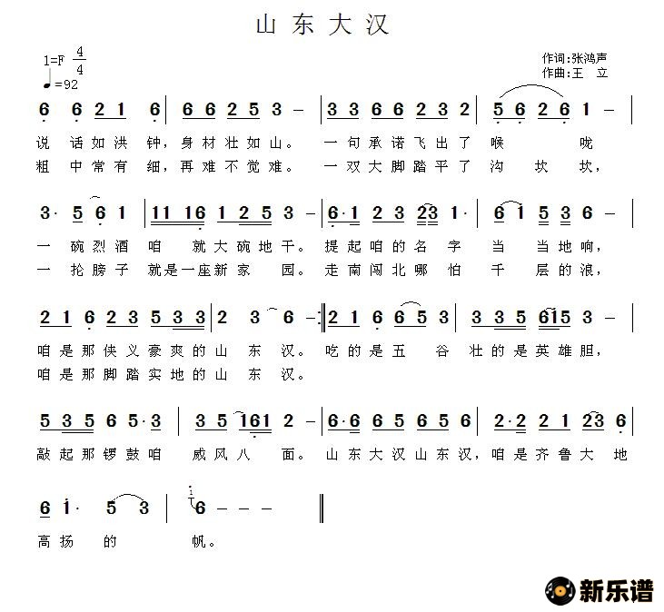 演唱的山东大汉(张鸿声词 王立曲)歌词,山东大汉(张鸿声词 王立曲)简谱.