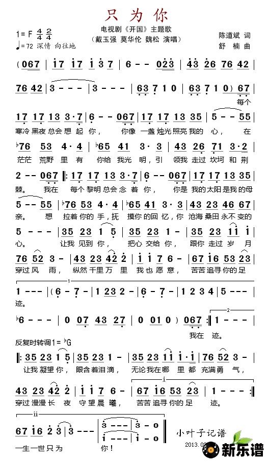 戴玉强/莫华伦/魏松演唱的只为你(电视剧《开国》主题歌)歌词,只为你(电视剧《开国》主题歌)简谱.