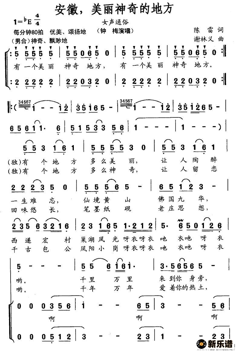 作词:陈雷 作曲:谢林义演唱的安徽,美丽神奇的地方歌词,安徽,美丽神奇的地方简谱.