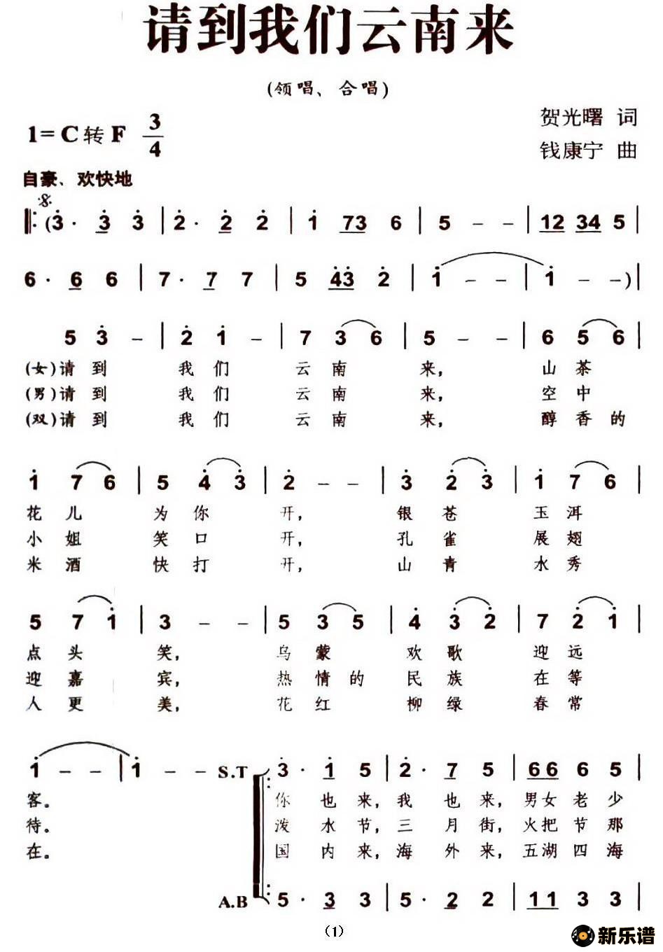 演唱的请到我们云南来歌词,请到我们云南来简谱.