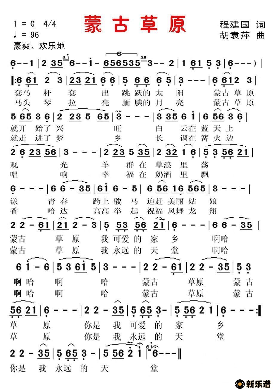 演唱的蒙古草原(程建国词 胡袁萍曲)歌词,蒙古草原(程建国词 胡袁萍曲)简谱.