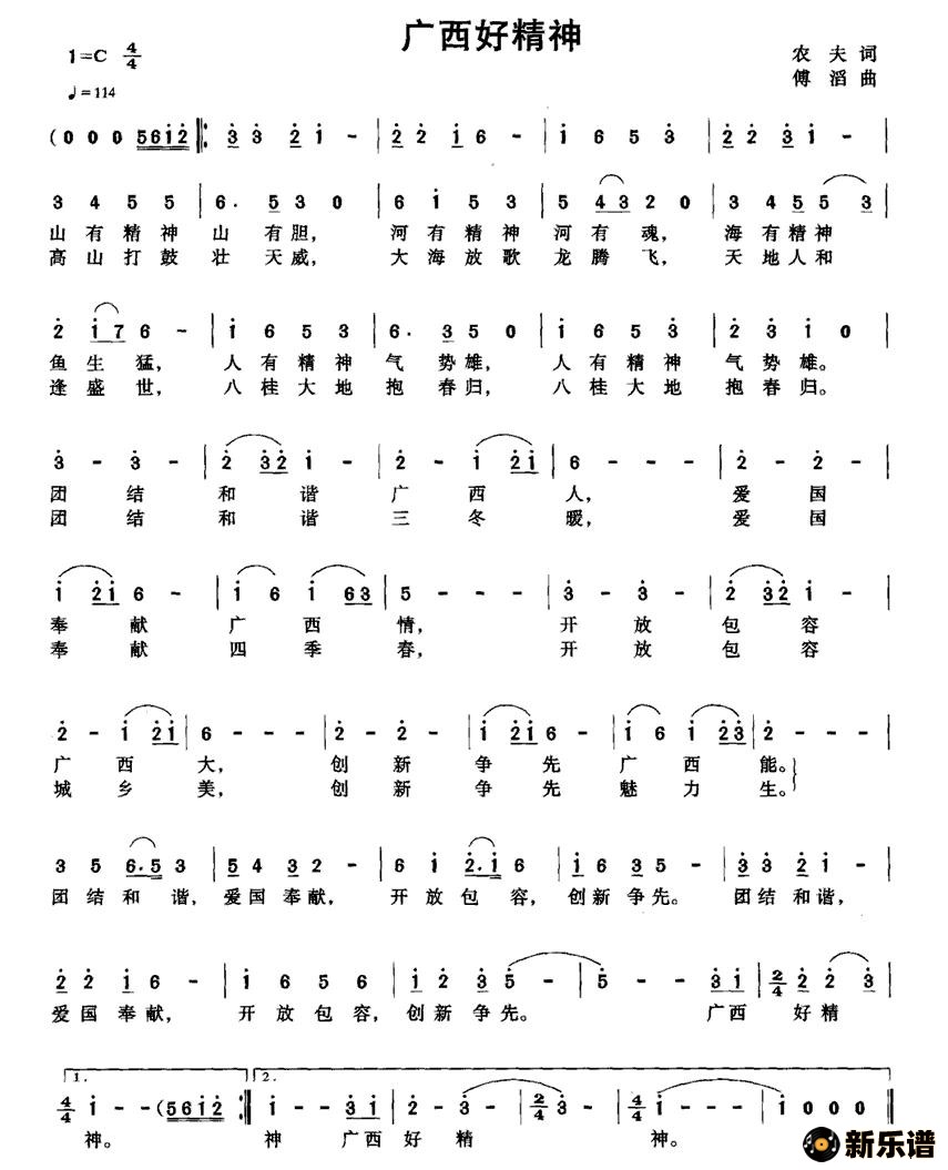 演唱的广西好精神(农夫词 傅滔曲)歌词,广西好精神(农夫词 傅滔曲)简谱.