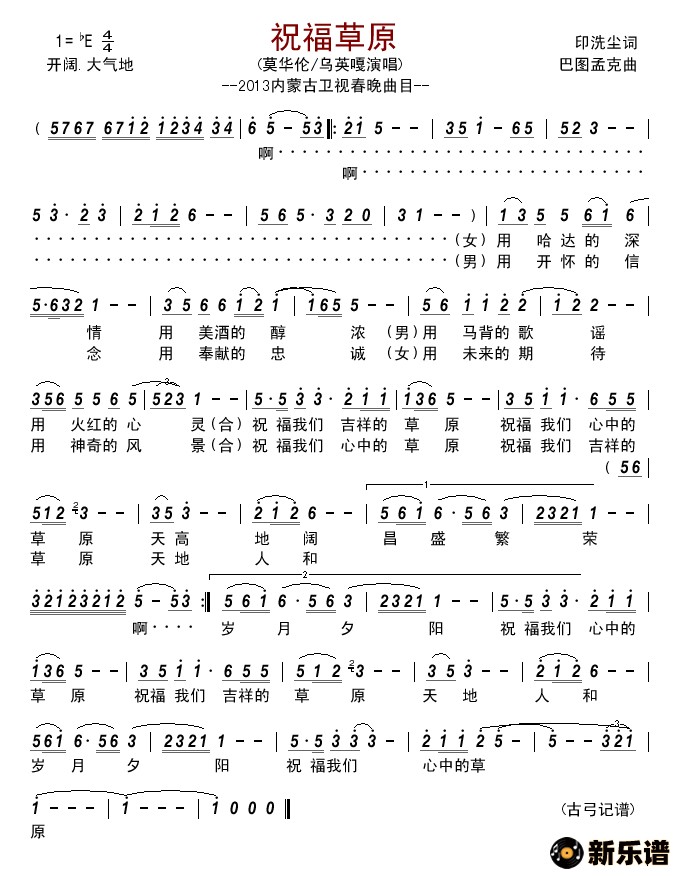 《祝福草原—2013内蒙古卫视春晚曲目》简谱 莫华伦/乌英嘎