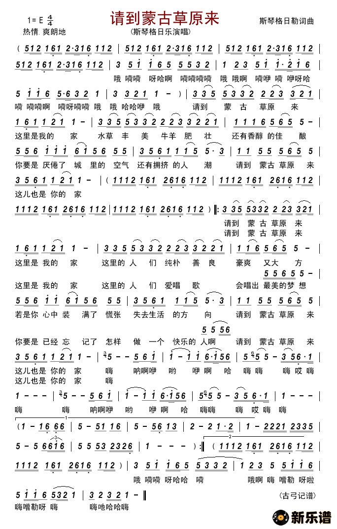 斯琴格日乐演唱的请到蒙古草原来歌词,请到蒙古草原来简谱.