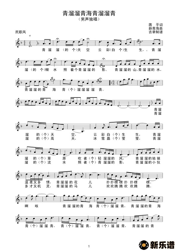演唱的青溜溜青海青溜溜青(线谱)歌词,青溜溜青海青溜溜青(线谱)简谱.