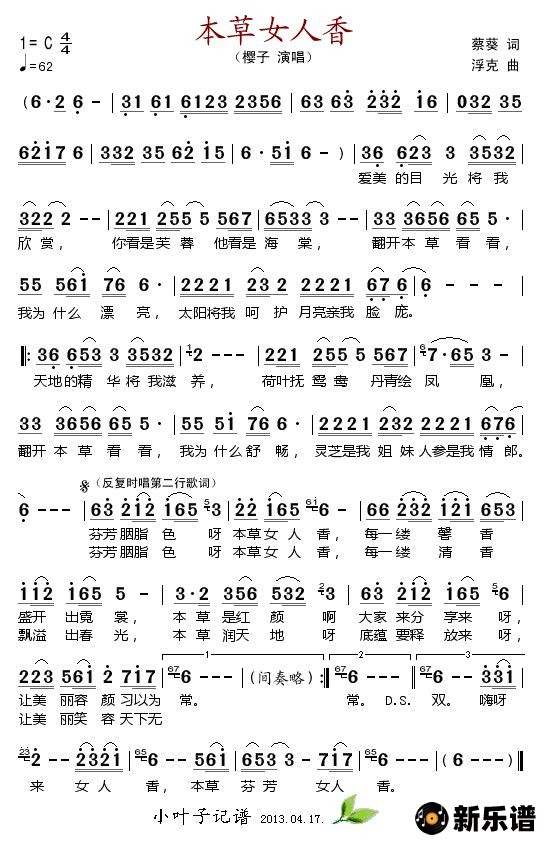 樱子演唱的本草女人香歌词,本草女人香简谱.