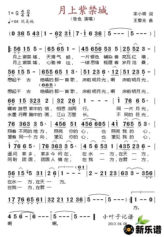 张也演唱的月上紫禁城歌词,月上紫禁城简谱.