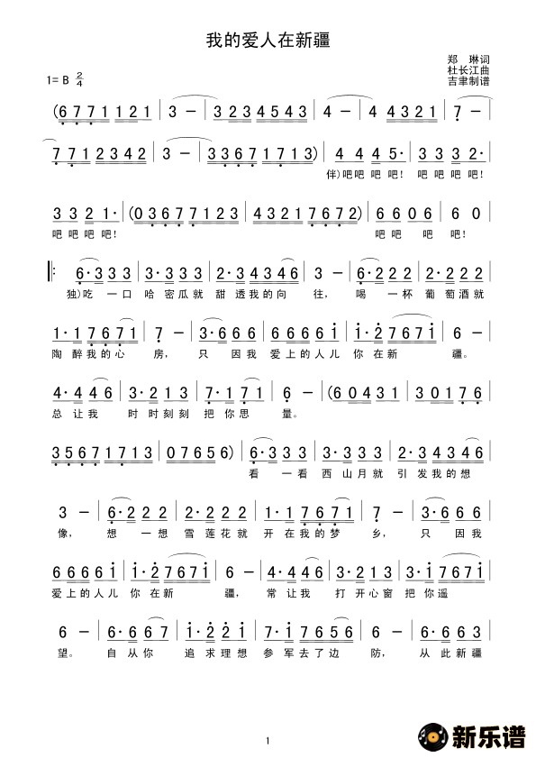 演唱的我的爱人在新疆歌词,我的爱人在新疆简谱.