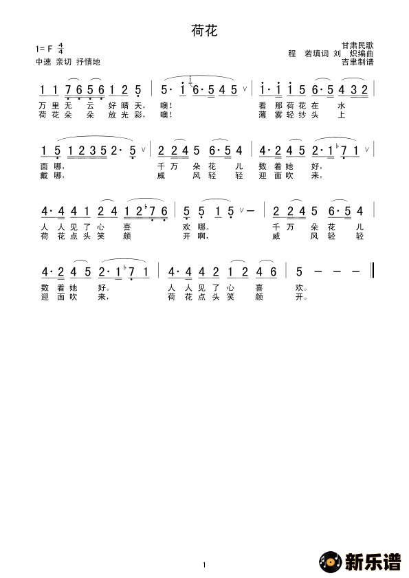 演唱的荷花(甘肃民歌)歌词,荷花(甘肃民歌)简谱.