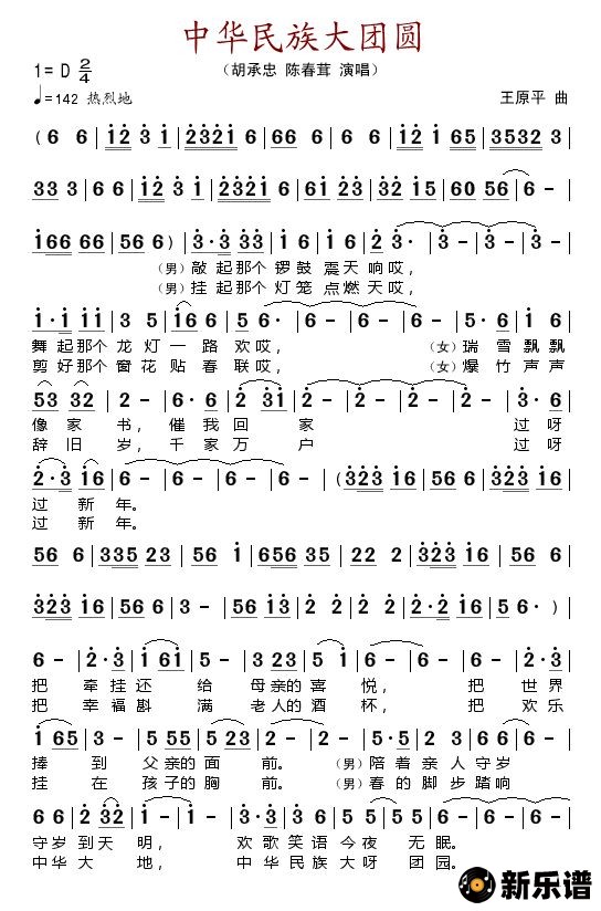 胡承忠/陈春茸演唱的中华民族大团圆歌词,中华民族大团圆简谱.