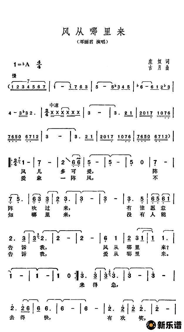 《风从哪里来》简谱 邓丽君-小叶子制谱