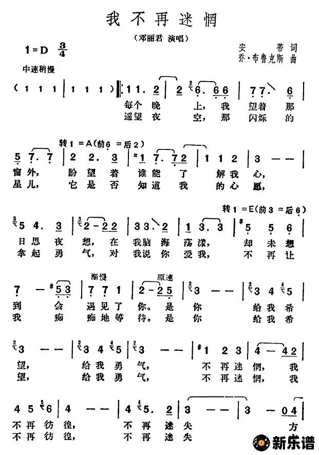 邓丽君演唱的我不再迷惘歌词,我不再迷惘简谱.
