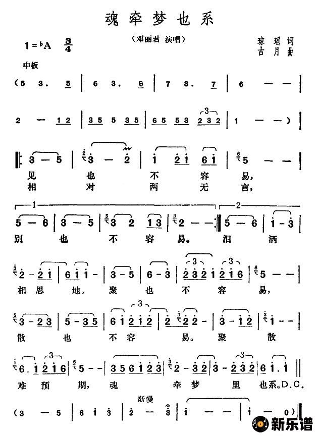邓丽君演唱的魂牵梦也系歌词,魂牵梦也系简谱.