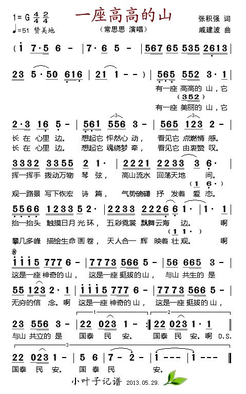 常思思演唱的一座高高的山歌词,一座高高的山简谱.